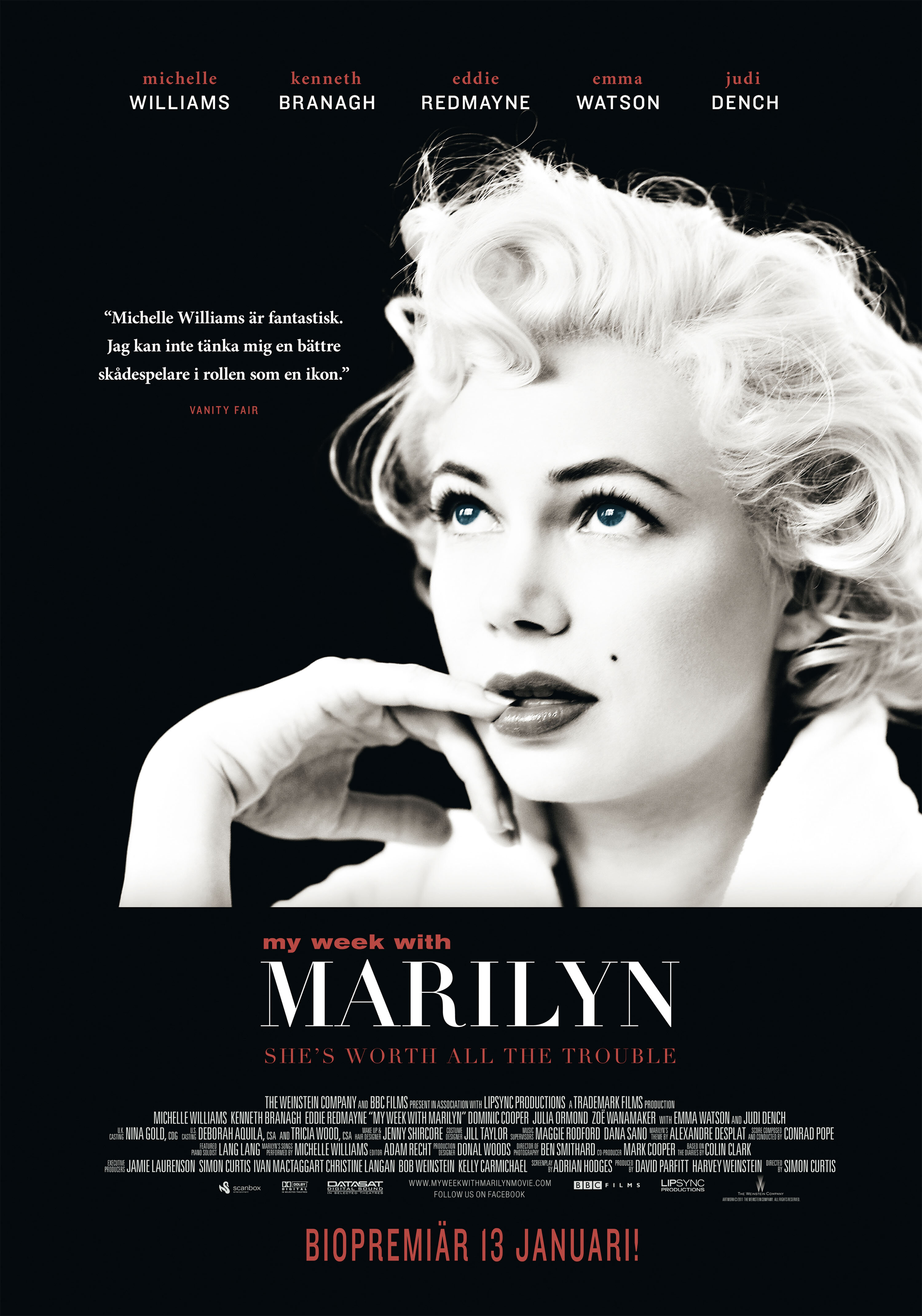 Сюжет «My Week with Marilyn» сродни хрупкой конструкции, внешне представляющей воспоминания Колина Кларка, который на деле выступает лишь в роли незначительного спутника, вращающегося на орбите пылающей звезды — настолько велико присутствие Мэрилин Монро в истории. Однако окружение звезды в киноленте Кёртиса временами оказывается не менее ярко и харизматично, чем образ самой блондинки, оно почти балансирует на грани. Кажется ещё немного — и те, кто должен выступать в роли живых декораций, вырвутся на первый план, затмив собой ту, ради которой все они и собрались. Но это не происходит хотя бы потому, что в идеале и не должно происходить. И не важно, что Кеннет Брана здесь плывёт в своей стихии, сидя в своей тарелке с шекспировской росписью по кайме. Не важно, что Джулия Ормонд в образе Вивьен Ли смотрится никак, а Эмма Утсон и Эдди Редмэйн присутствуют всё же скорее ради галочки в фильмографии. Главные здесь вовсе не они, ибо с появлением на экране Мишель Уильямс все остальные превращаются в живые декорации, удел которых — созидать.