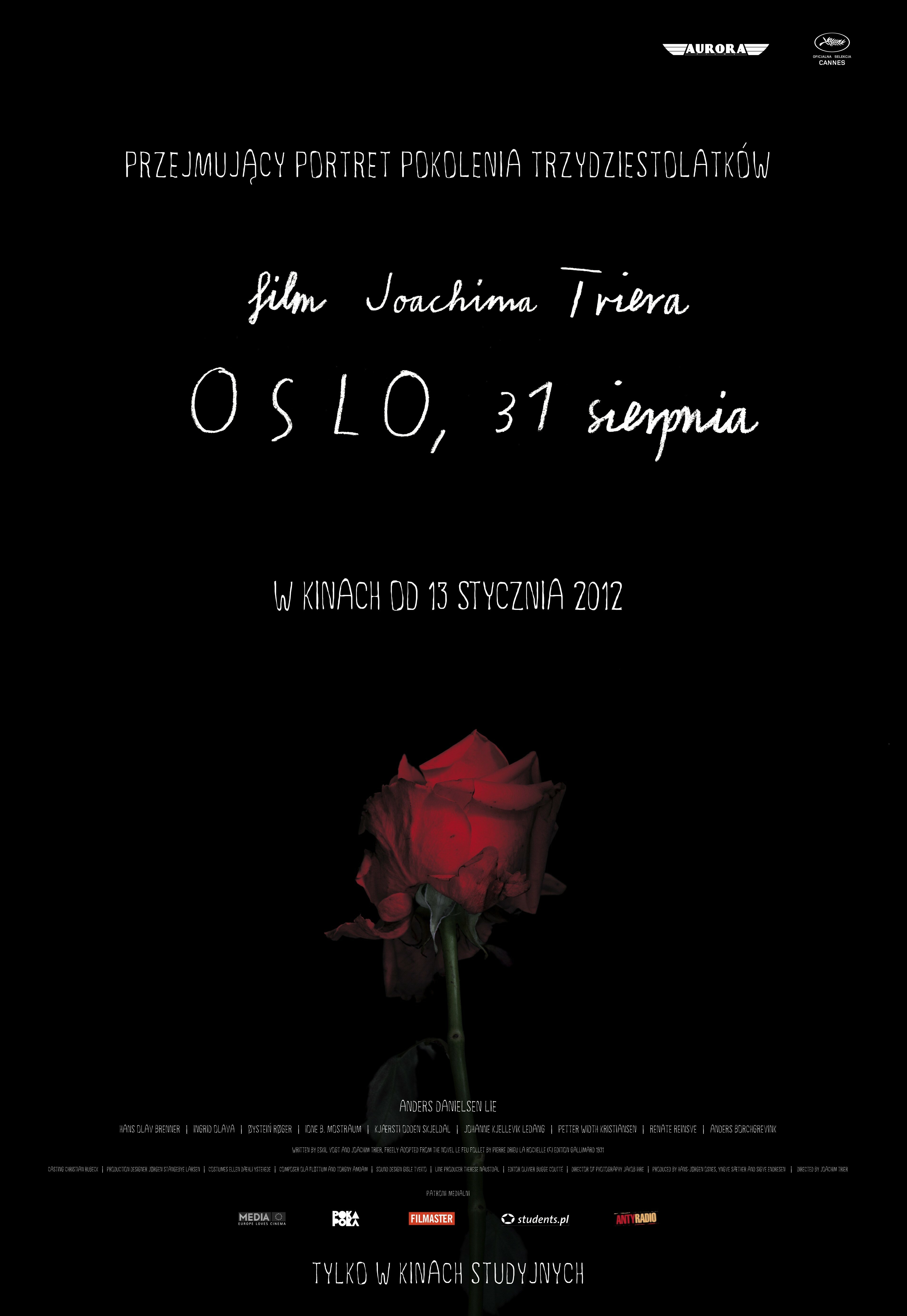 Андерс Даниелсен Лье, которому досталась главная роль в фильме — непрофессиональный актёр (а по профессии — врач), уже второй раз снимается у Триера. Это на редкость выразительное лицо сложно забыть, взгляд, полный боли, внимательный слушатель, случайный гость на вечеринке, печаль сменяется чёрным юмором, сломленный человек, швыряющий своё резюме в урну — переломный момент, где «будущего для меня нет». Препараты не разрушили его тело, но убили его надежду. Каждая улочка в этом городе ему знакома, он вырос здесь и рад бы вырваться, но не сможет: это сцена в кафе, где герой прислушивается к разговорам вокруг него, а камера Триера мягко смещает акценты от стола к столу, наполняя искренней любовью моменты повседневной банальности, что может оценить только тот, кто чувствует себя настоящим изгоем. Рой голосов звучит как молитва — только это не «Небо над Берлином» Вендерса, это Осло, характер сам по себе, а поэзия и визуализация города напомнит о работах Эрика Ромера, Андрея Тарковского, Терренса Малика. Финальные кадры — зеркальное отражение самого начала фильма, жизнь продолжается, за тридцать первым августа следует первое сентября.