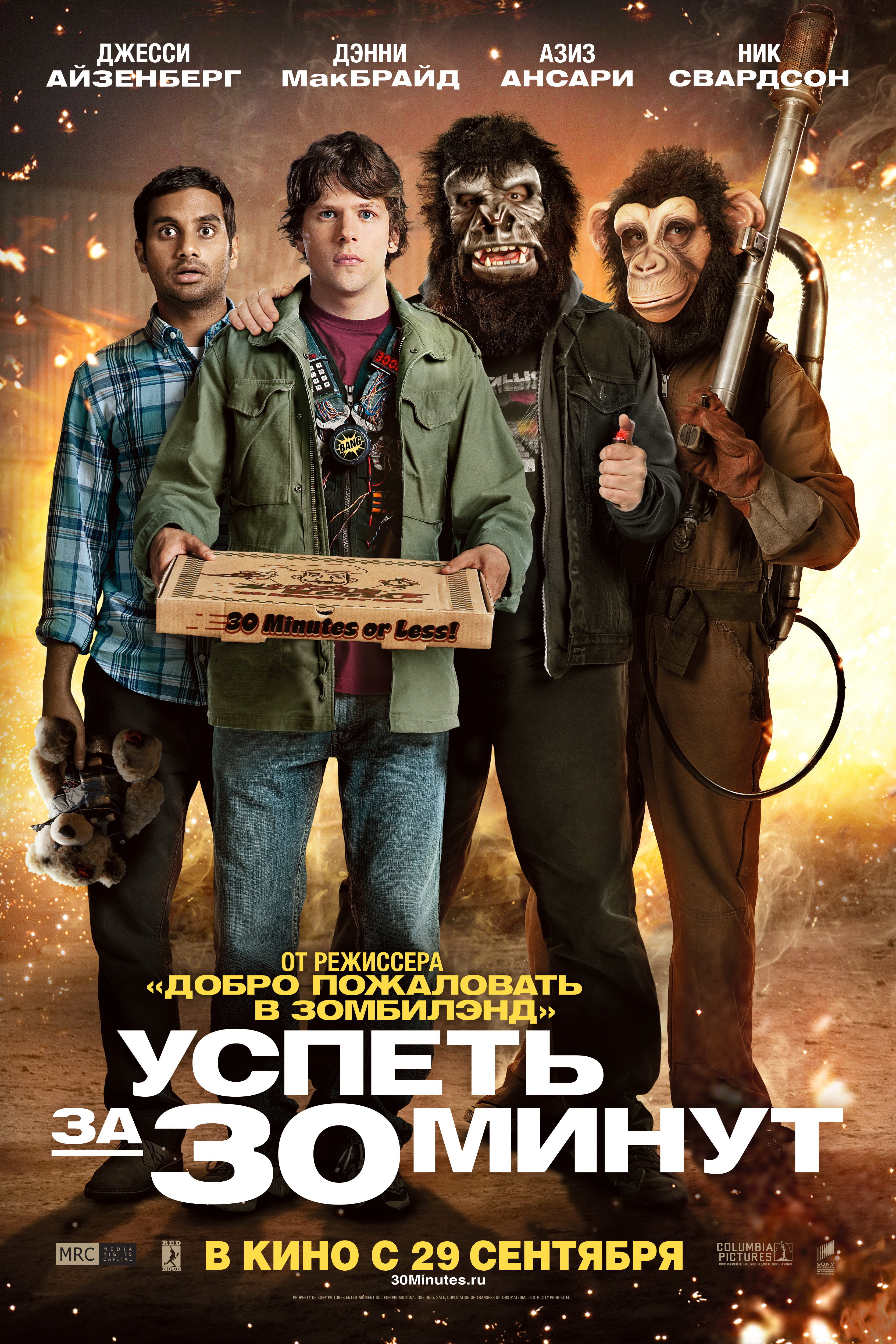 Итак, две составляющие будущего просмотра: «снова комедия» + «снова дуэт режиссера Рубена Фляйшера и актера Джесси Айзенберга» (или что тоже самое: «Добро пожаловать в Zомбилэнд» — угарное было кинцо) = «Успеть за 30 минут» (30 Minutes or Less, 2011) просто обязан был порадовать зрителя. Но видно в Голливуде раз на раз не приходится…