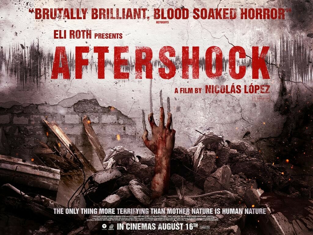 Фильм «Афтершок», снятый в 2012 году режиссером Николасом Лопезом по сценарию Элая Рота, выступившего в картине также в качестве исполнителя одной из главных ролей и сопродюсера, имеет в своей базовой основе оригинальную идею о темной сути человеческой природы в противовес стихии природы окружающей. Однако эту интересную идею все-таки загубило весьма стандартное ее воплощение, ибо собственно хоррору как таковому в ленте предшествует длинная-предлинная завязка, благодаря которой зритель знакомится с главными героями, а на ужасы отведено немногим более получаса в общем хронометраже и сняты они оператором Антонио Керсиа довольно реалистично, передавая весь ужас произошедшей ситуации зрителю, хотя в некоторых сценах наличествует и легкий черный юмор. Сюжет картины не страдает излишней перегруженностью, потому особо неожиданных и нестандартных поворотов ждать не приходится, хотя фильм смотрится с интересом и не отпускает зрителя вплоть до финала, несколько банального, но в рамках данной картины вполне уместного и обоснованного.
