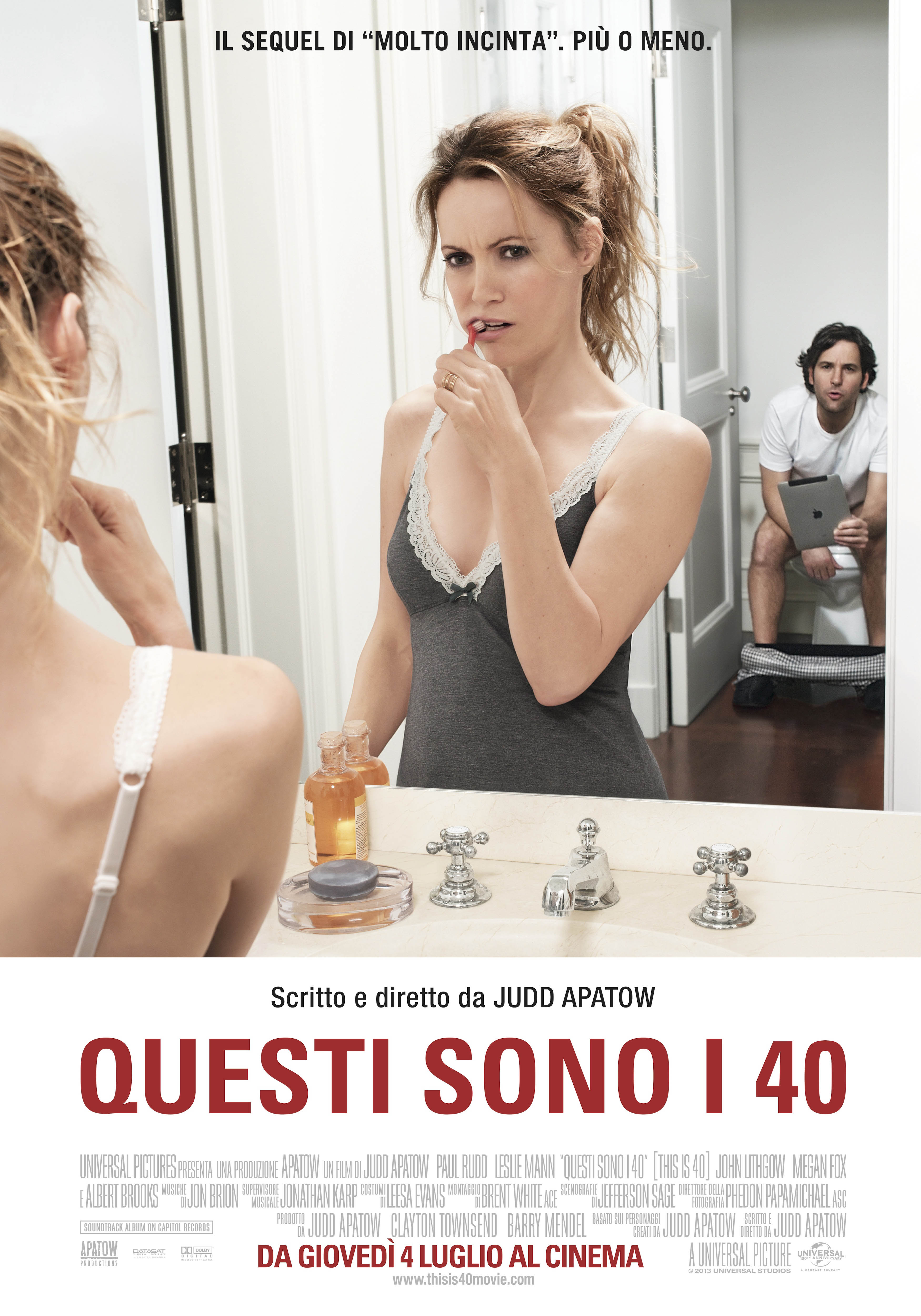 После того как все формальности соблюдены (вся «правда тела» приходится на первую треть фильма, словно это действительно какая-то верификация), начинается фирменная апатовская комедия с блестящими диалогами и неожиданными поворотами сюжета, который, наверное, должен был показать обычную американскую семью, счастливо переживающую кризис среднего возраста (настоящее название фильма «This is 40» — «Вот и сорок»).