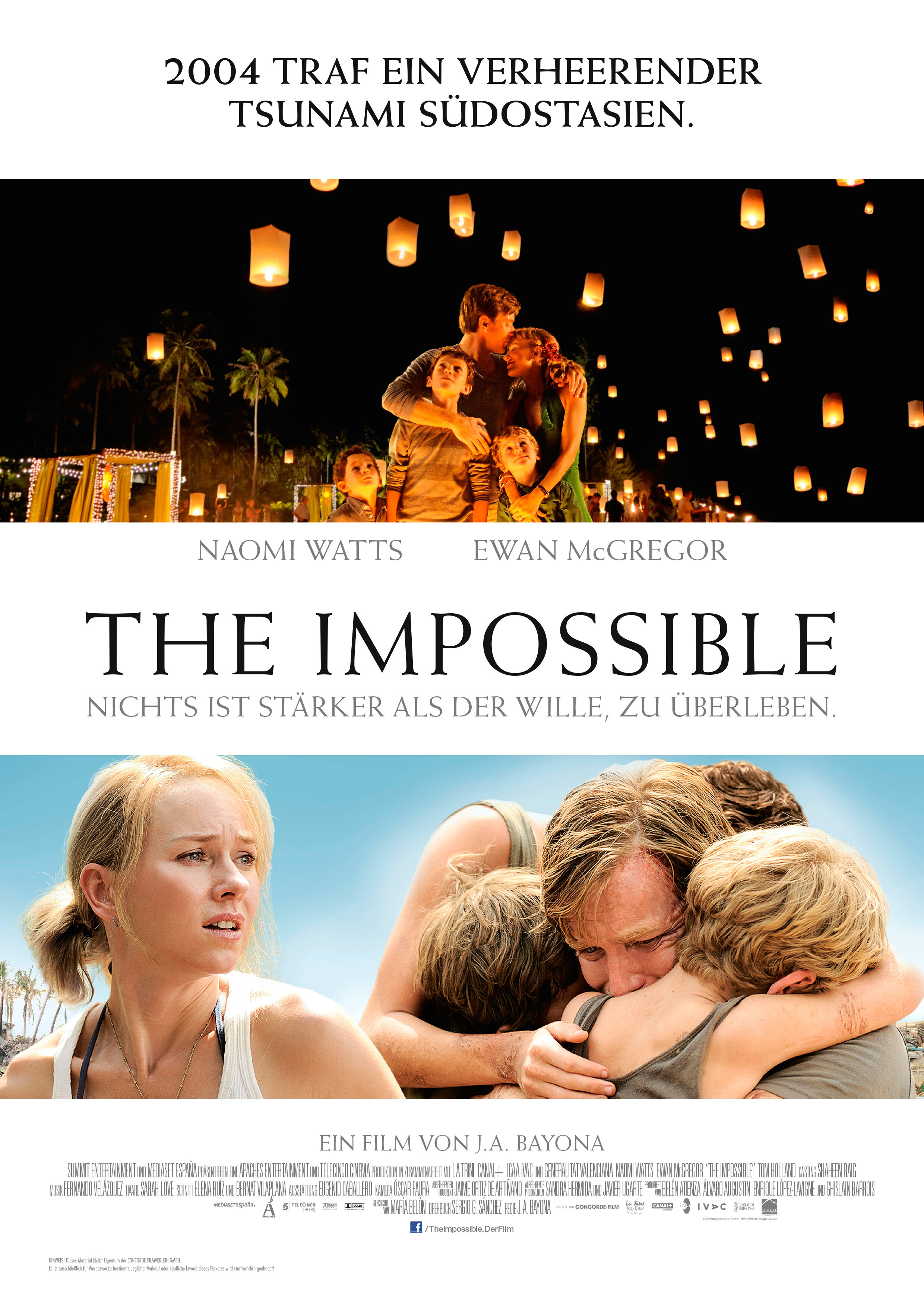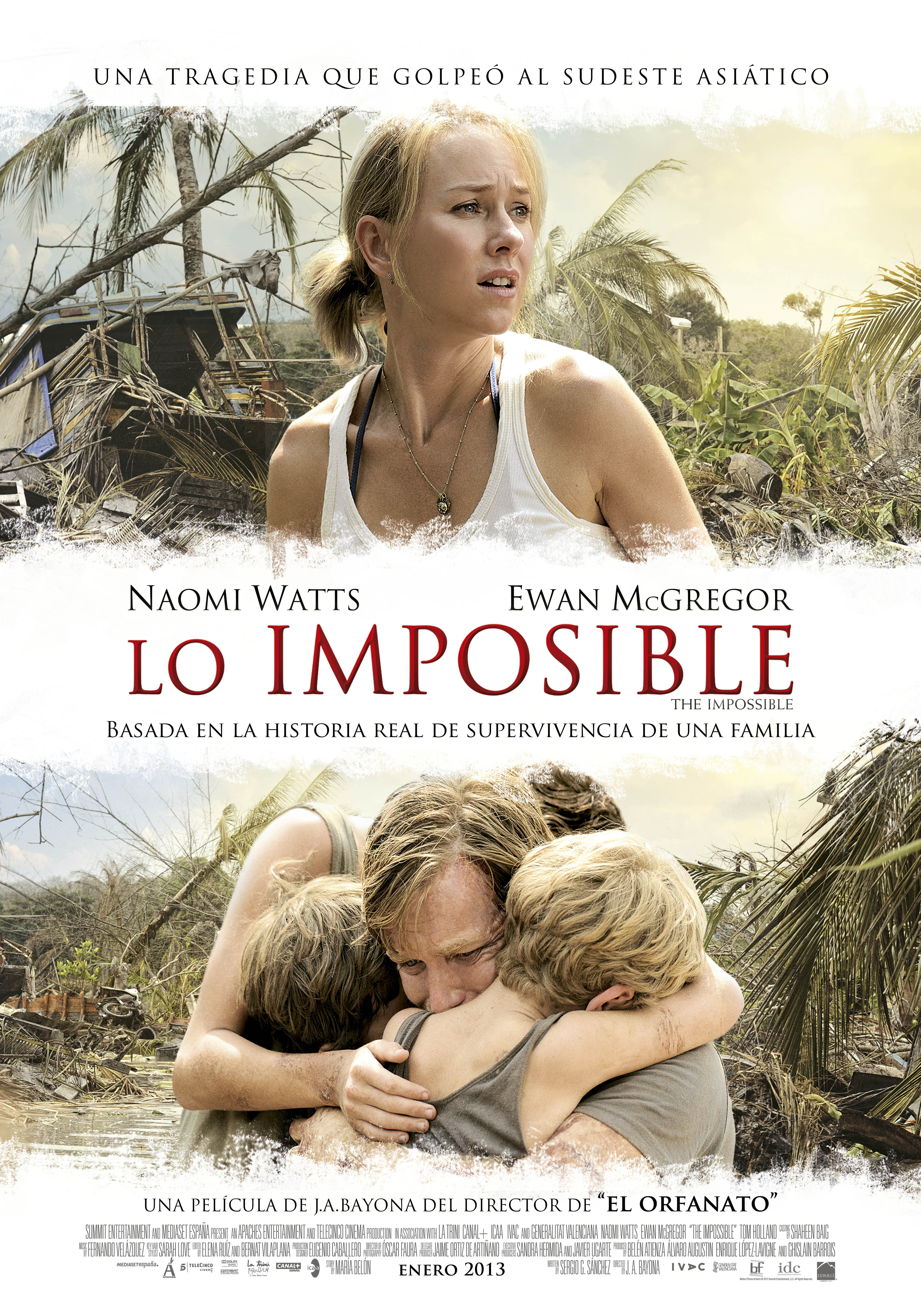 Чудовищное цунами, захлестнувшее в декабре 2004 побережье Индийского океана, забрало жизни более двухсот тысяч человек. Оно было признано самым смертоносным стихийным бедствием в современной истории. Испанская семья — Мария, её муж Энрике и трое их сыновей были на отдыхе в Тайланде, когда случилась эта страшная катастрофа. Фильм «Невозможное» предлагает нам увидеть их невероятную историю.