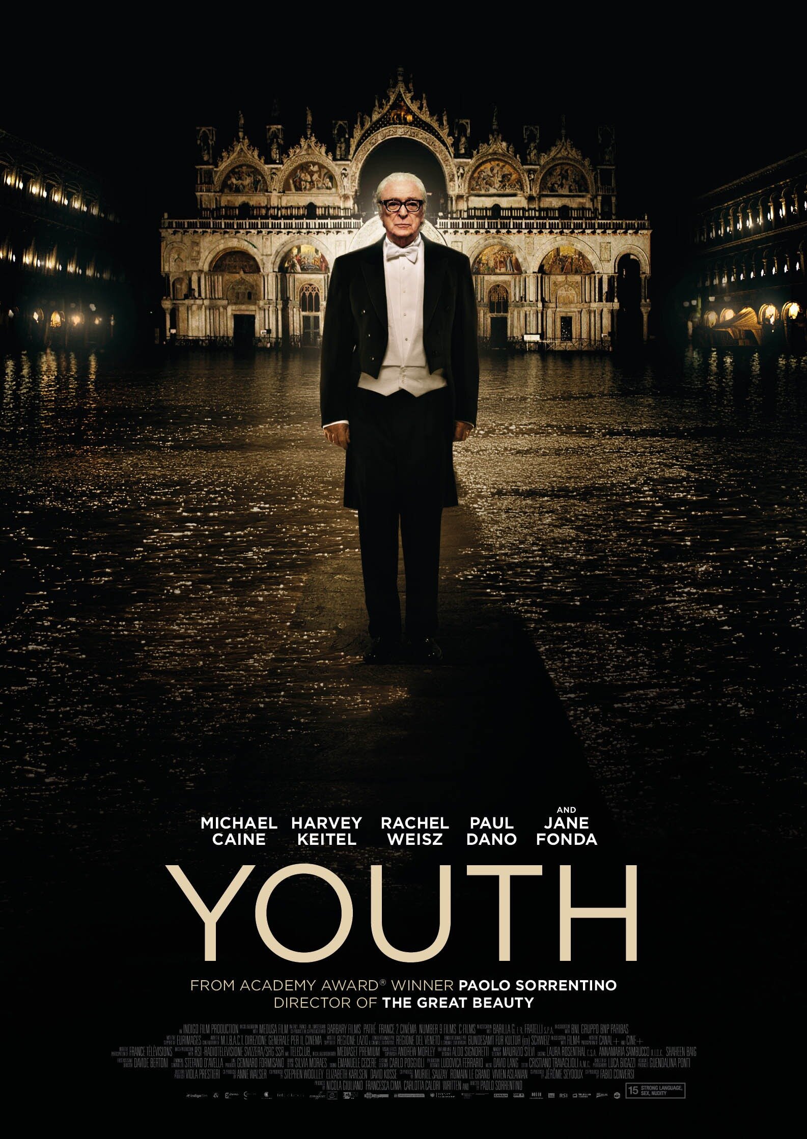 Режиссерская чуткость в выборе темы и подходе к ней раскрывается и на актерском уровне, кажется, что так работать с артистами сегодня умеет только он: снимать звезд мирового уровня словно бы без из звездного статуса, уметь сконцентрировать фильм вокруг центрального героя, при этом не умаляя значения всех остальных. Майкл Кейн, для которого, по признанию самого Соррентино и писалась роль Фреда, блистает в том числе и своей белоснежной сединой, но не затмевает ни Харви Кейтеля, ни Рейчел Вайс, ни Пола Дано, ни Джейн Фонду.