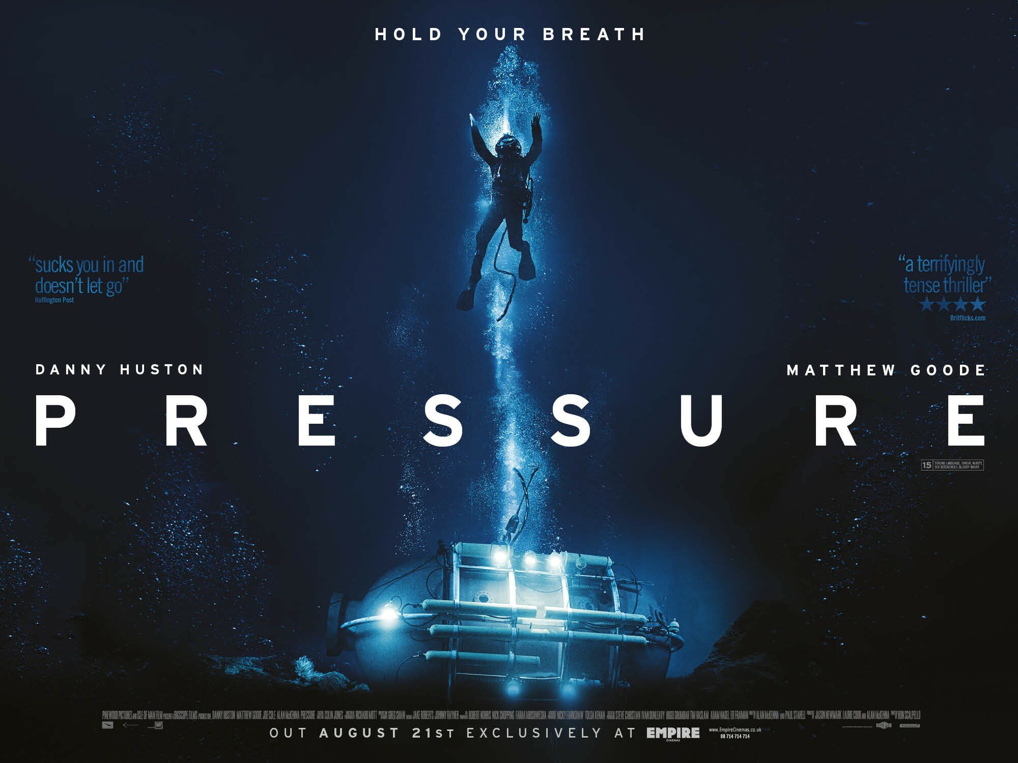 Фильм выстроен в основном на крупных планах, и слабые актеры уж точно не справились бы с такими ролями. Дэнни Хьюстон исполнил роль деятельного и немногословного глубоководного специалиста, не привыкшего сидеть сложа руки. А Мэттью Гуд — пассивного лидера, который с трудом удерживает контроль над ситуацией. На контрасте героев и разности их характеров — строится основной конфликт картины. Мне очень понравилось, как уже статные, видавшие жизнь персонажи постепенно теряют самообладание. Здесь вам и отчаянный героизм, и неосторожность, и банальная глупость, и паника.