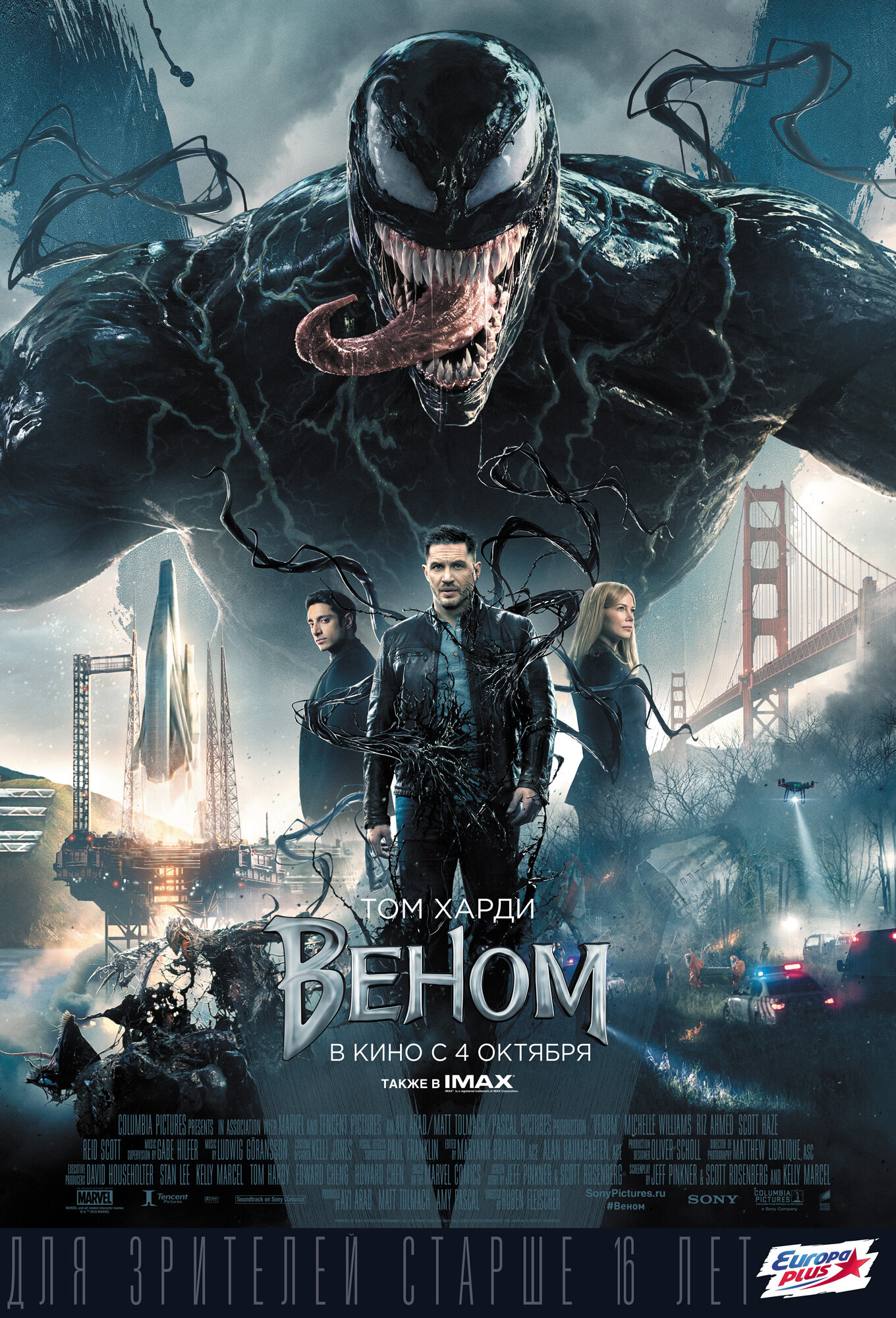 Беда сценария заключается даже не в банальном противопоставлении «герой-злодей». Местный гад, определенно скопированный с Илона Маска, толкает речи о умирающей планете, одержим идеей симбиотов и ведет себя как козёл, потому что нужно вести себя как козёл. Просто пару раз показать, как персонаж Риза Ахмеда отправляет подопытных на смерть недостаточно, получился обычный злодей, такой же заезженный, как и любовная линия Эдди и его бывшей невесты. Героиня Мишель Уильямс находит довольно туманный повод для расставания с Броком, хотя общение между ними проходит нормально. А сам Том Харди, наоборот, нареканий не вызывает. Пару раз явно переиграв, он все же показал добротный перфоманс. Взаимодействие с Веномом показано хорошо, их союз приносит удовольствие. Хотя вопросы все же возникают. Представьте, в вас вселяется инопланетная сопля, управляет вашим телом и общается с вами в голове. Это неслабый шок. А Эдди с Веней как будто сразу были лучшими друзьями, которые по пятницам пиво пьют и шоколадом закусывают.