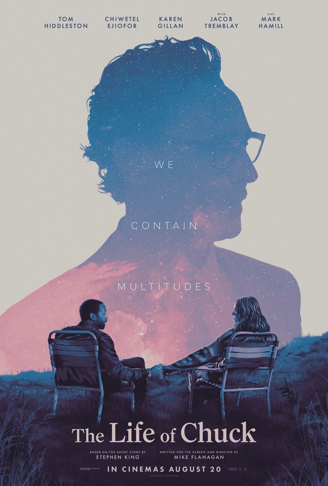 Я - фанат Стивена Кинга. Всё, что он делает, для меня интересно и ценно. Даже фрагментарная, алогично устроенная, неканоническая повесть 'Жизнь Чака' - как и её экранизация, вобравшая в себя все странности оригинала, включая насмешливую трехактную структуру - хотя история настолько далека от классической трехактной драматургии, как мы от Полярной звезды, эффектно гаснущей в фильме. Мы начинаем следить за героями - школьным учителем (Стивен, мы тебя узнали) и его бывшей женой, воссоединяющимися на фоне конца света как в 'Меланхолии' или 'Не смотри вверх', чтобы отмотать историю на год назад и наконец-то увидеть загадочного Чака. Исполняющий его Том Хиддлстон появляется во плоти примерно на сороковой минуте фильма, чтобы сыграть кульминационную сцену в духе финала 'Ещё по одной' (кульминация в середине, шах и мат учителя киношколы!) и снова исчезнуть, уступив место своей детской версии - мальчиков будет аж трое, но больше всего внимания заслуженно получает юный Бенджамин Паяк, у которого большое киношное будущее. Другому автору такой чехарды с фокалом зрительского внимания я бы не простил, но это же Кинг - так что моё мнение предвзято.